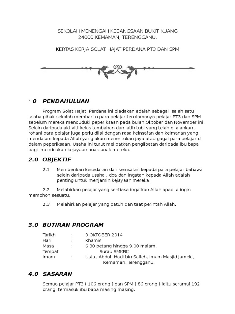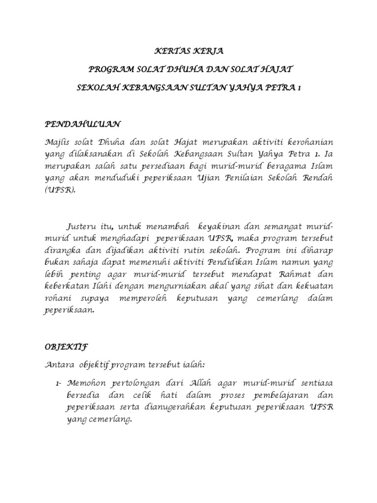 Matlamat Program ini dirancang adalah untuk kecemerlangan akademik SK Berisu sesuai dengan Falsafah Pendidikan Kebangsaan yang ingin melahirkan insane yang seimbang dari segi jasmani emosi rohani dan intelek. Kertas kerja solat hajat 1. 10 PENDAHULUAN Program Solat Hajat Perdana ini diadakan bertujuan bagi membantu para pelajar di Madrasah Tahfiz Al-Quran.