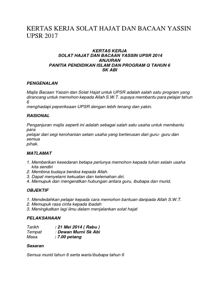 KERTAS KERJA SOLAT HAJAT TERKINIdoc. Majlis Bacaan Yassin dan Solat Hajat untuk UPSR adalah salah satu program yang.